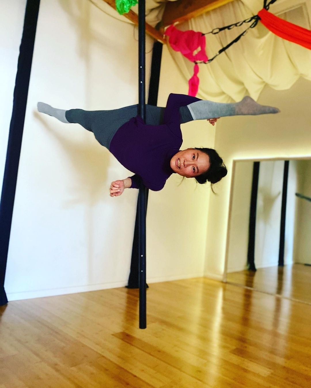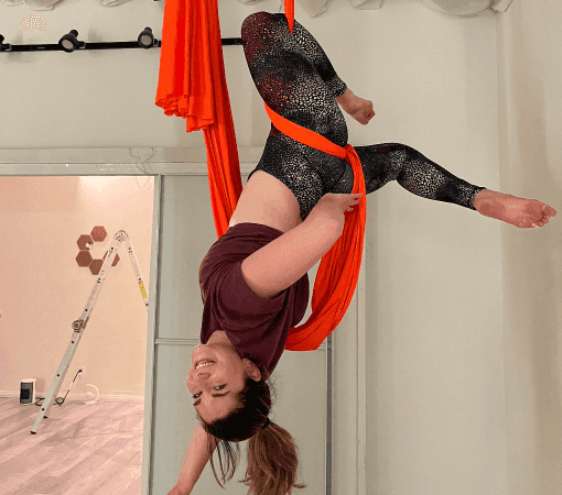 Chiara fell in love with being upside down some years back, but got “ serious” about aerial when she found Bootea Flow. Chiara received her Aerial teacher training certification in 2023 and has enjoyed teaching students of all levels since then! When not dangling from a hammock or a pole, Chiara likes to hang out with her cats (right side up in this case), try new food and binge read novels.